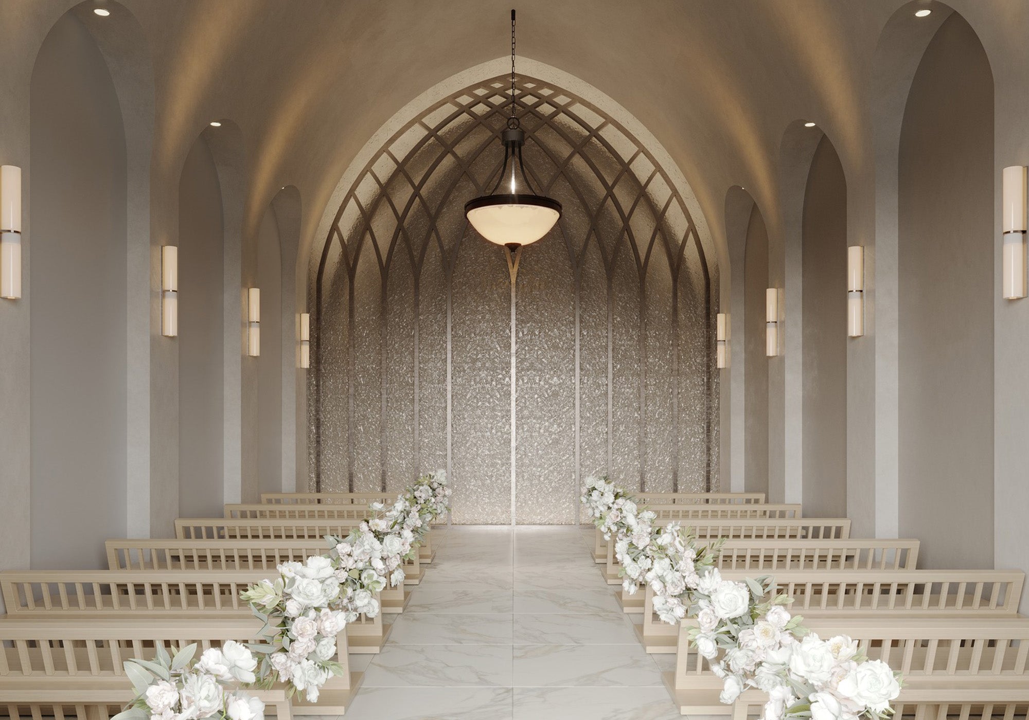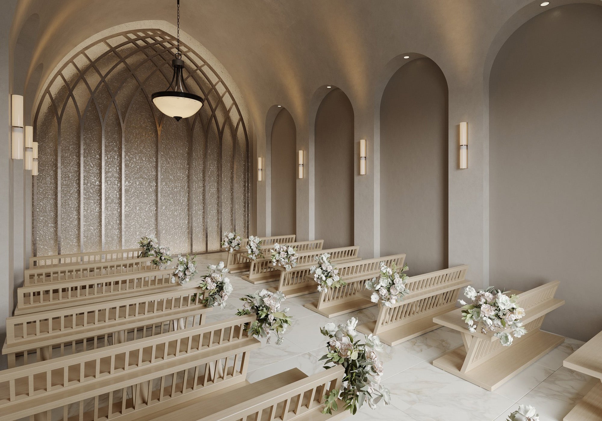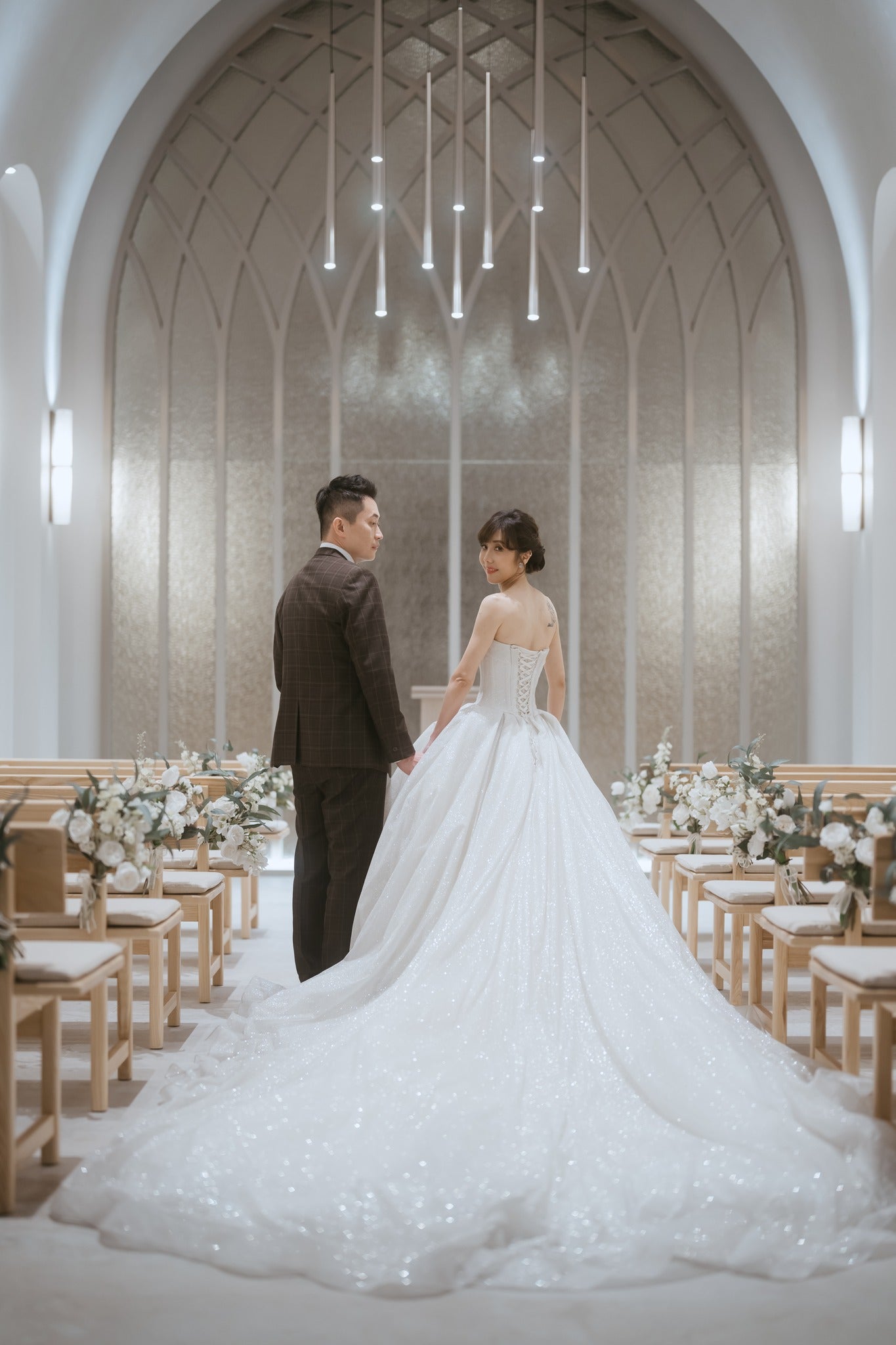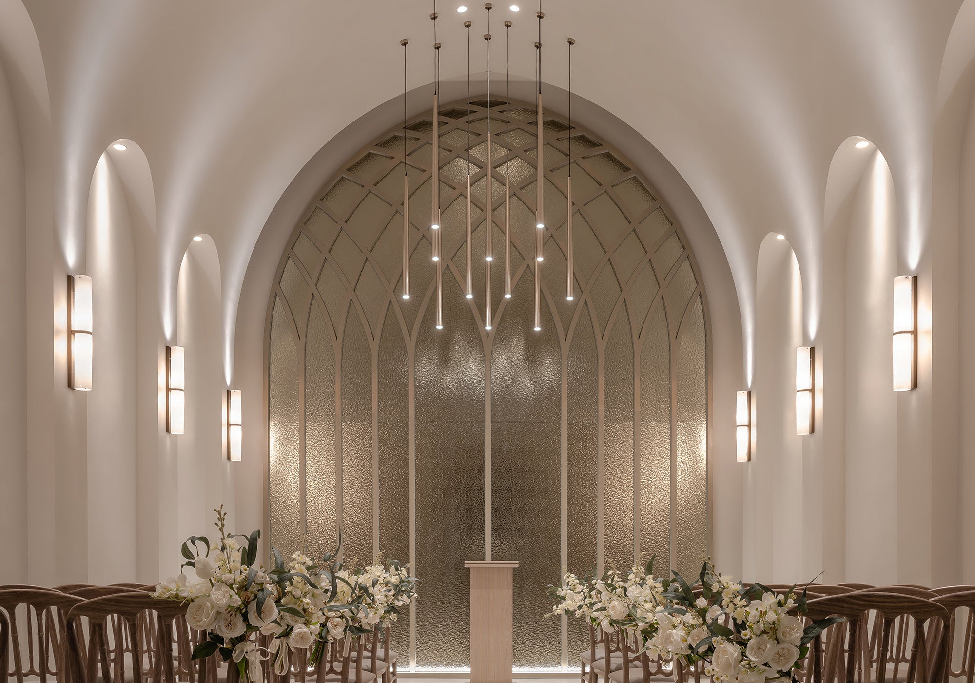 高至天花板的拱型玻璃,以精緻的金色線條浮雕點綴,古典建築的厚實感與柔和的光影相襯,在如夢似幻的氛圍下見證愛情。